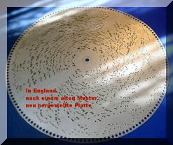 Hier sind die Lochplatten direkt zu sehen. Diese erzeugen einen Klang. Beschädigt ist, wie bei fast allen Spieluhren, der Tonkamm.